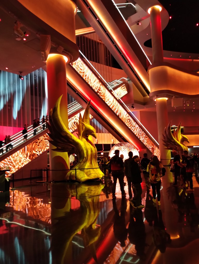 The doors opened, everyone cheered, and we flowed in. The interior room was decked out in Odyssey colors, there were huge golden phoenix inflated “statues” for selfies, there was a huge panel of little fans making hologram-ish displays of rotating angels.