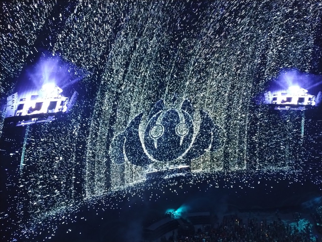 They checked our tickets again at the doors to our section, then we found our seats (in the 200 level). The circular interior was lit up with an image appearing to be a humongous quilt made of squares cut from Illenium jerseys from tons of past shows, detailed down to the quilt stitching on the edges of every square, the quilt appearing to gently undulate, light and shadow playing across it as if it were a gently blowing curtain.