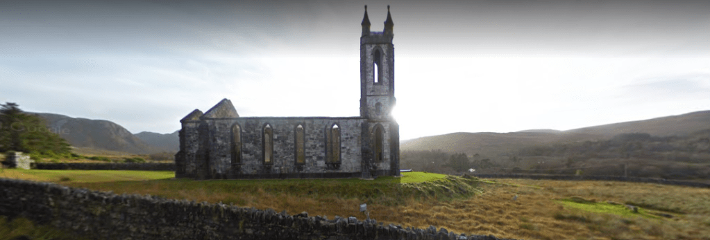 A beautiful white marble church ruin rests just south of Mount Errigal. Although Marcel spent some memorable days in picturesque Gweedore, he doesn’t mention this lovely edifice. The reason for this is that his visit was in the 1330’s, and the church wasn’t built until the 1850’s.