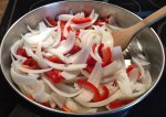 Cut beef into thin strips, set aside. (I use whatever cut of beef is on sale. A couple of pounds.) Slice up the onion and red peppers.