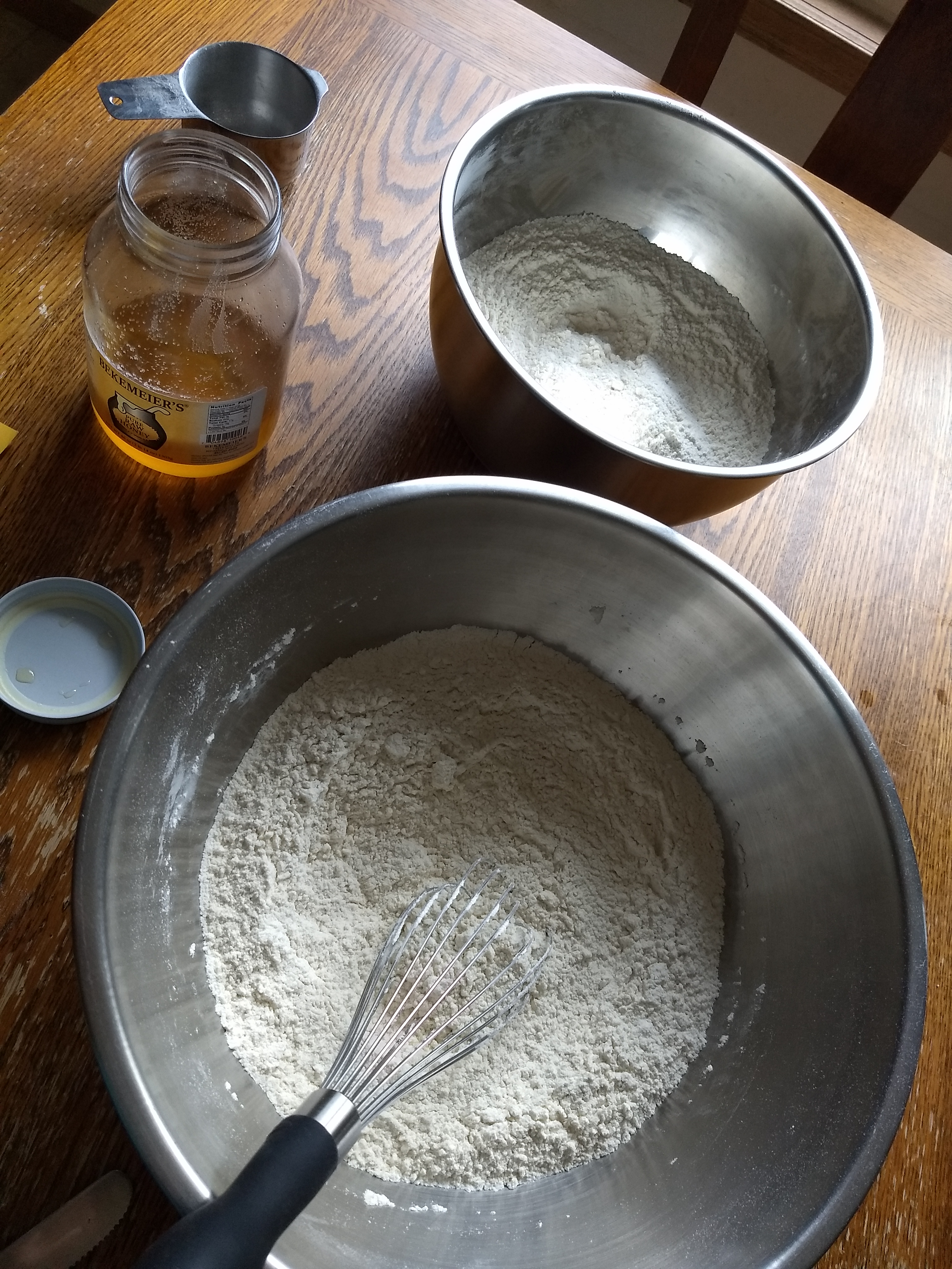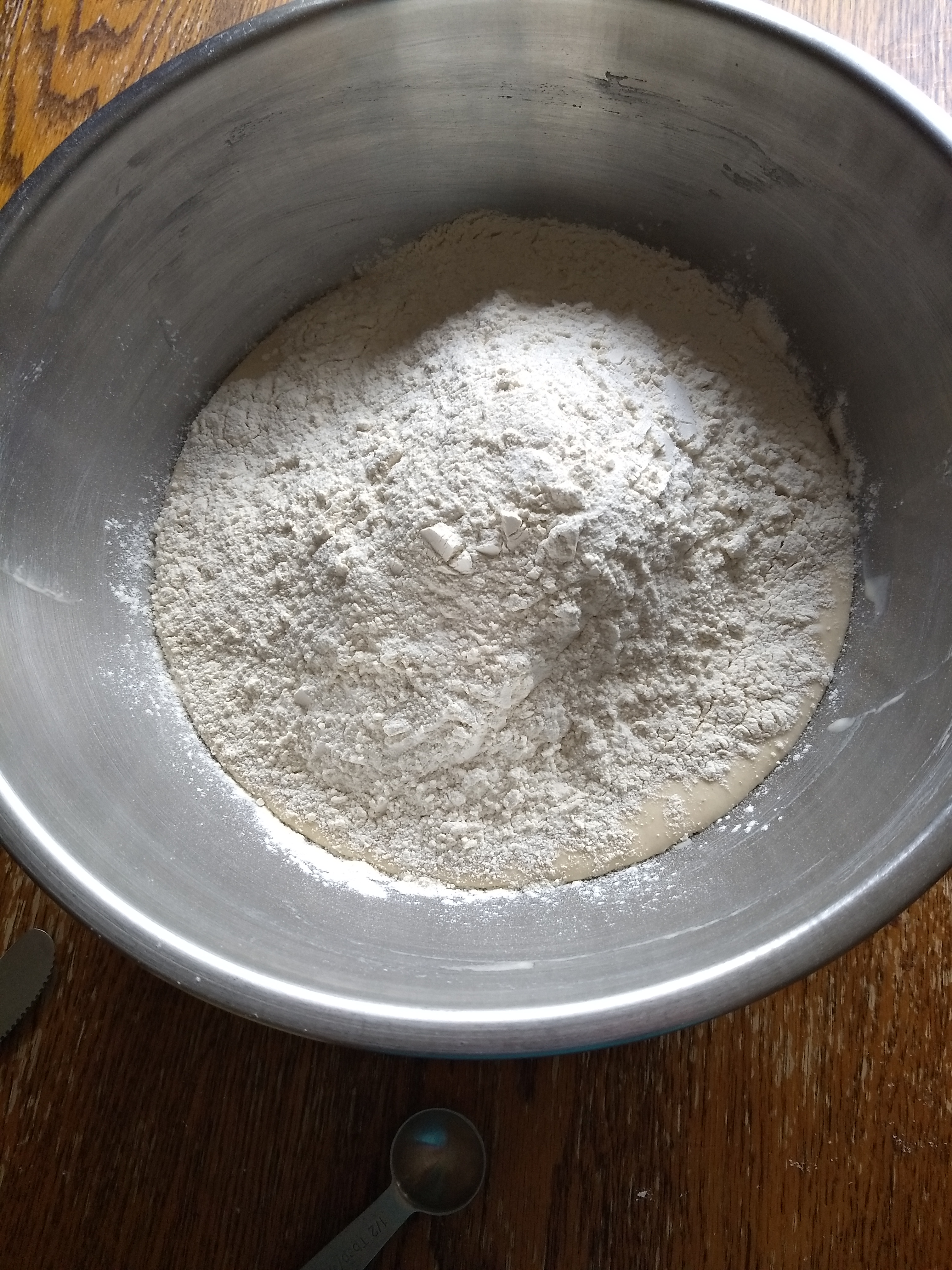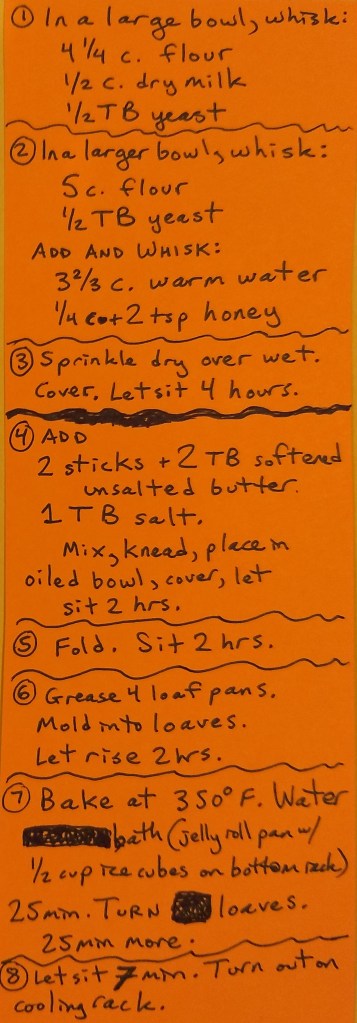 This is an over-simplified, personal shorthand version of the recipe the heroine shared with Thomas during “Stasis.” If you want the real instructions, you’ll have to go to the Bread Bible, and look up “Basic Soft White Sandwich Loaf.”